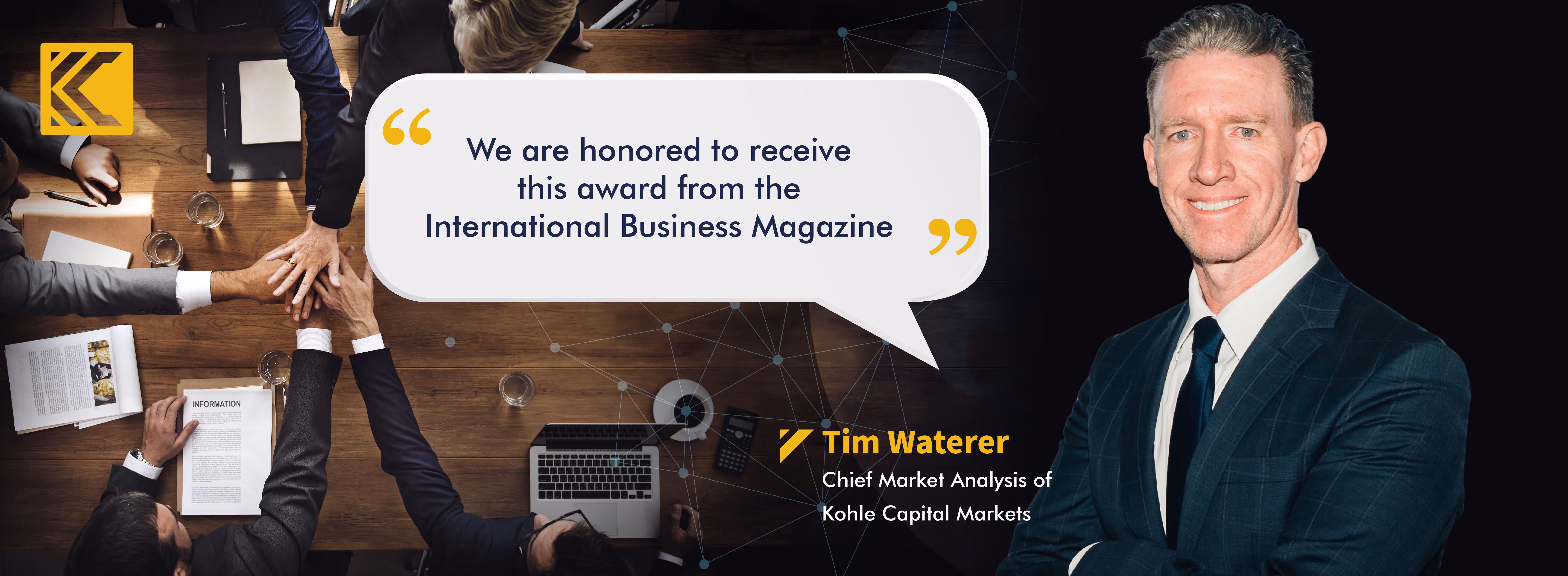 "Chúng tôi rất vinh dự khi nhận được giải thưởng này từ Tạp chí Kinh doanh Quốc tế", Tim Waterer, Trưởng phòng Phân tích Thị trường của Kohle Capital Markets cho biết. "Đây là minh chứng cho sự chăm chỉ và tận tụy của đội ngũ chúng tôi, những người đã làm việc không biết mệt mỏi để cung cấp cho khách hàng các dịch vụ giao dịch tốt nhất có thể. Chúng tôi cam kết đổi mới và giải thưởng này là nguồn cảm hứng để tiếp tục thúc đẩy ranh giới của những gì có thể trong ngành giao dịch".